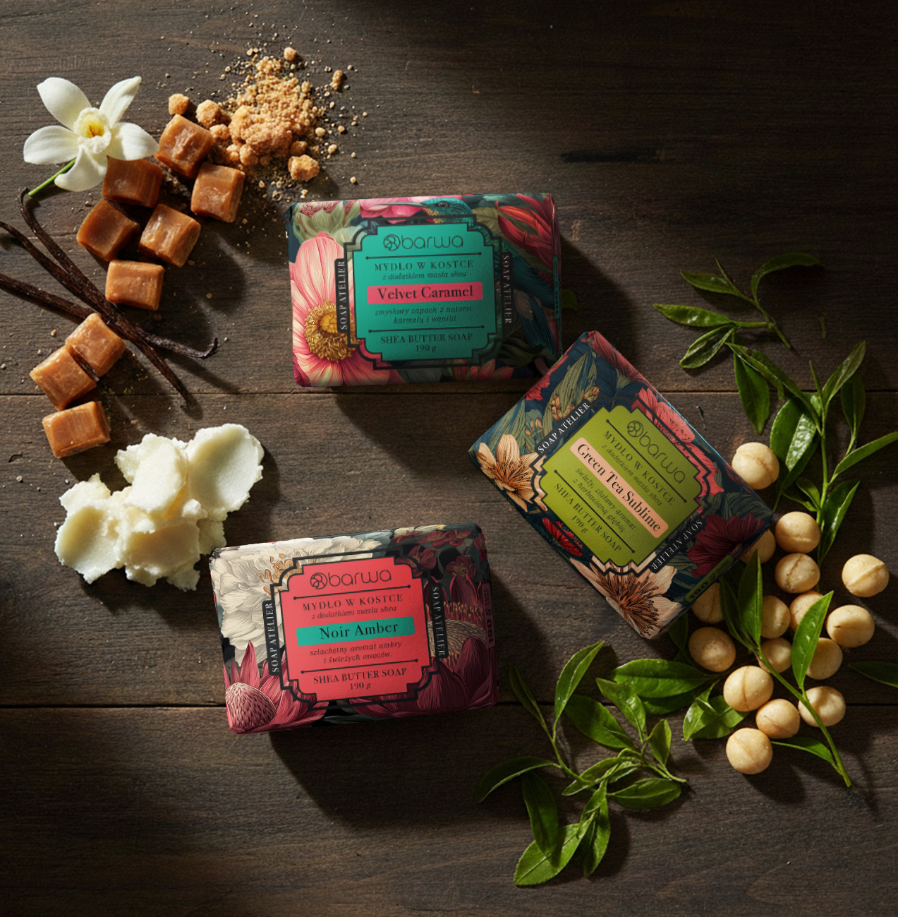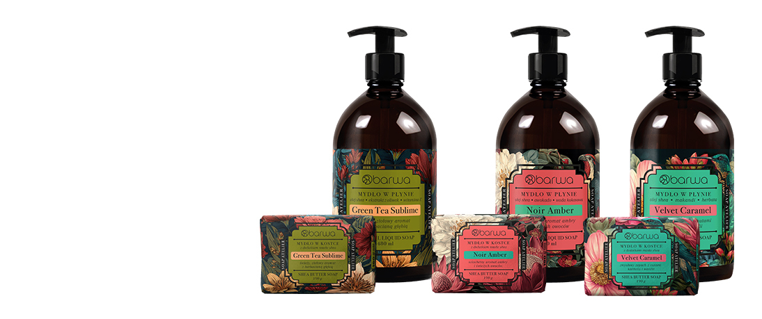 - Składniki pielęgnujące – mydła w kostce zawierają odżywcze masło shea, a mydła w płynie – nawilżający olej shea.