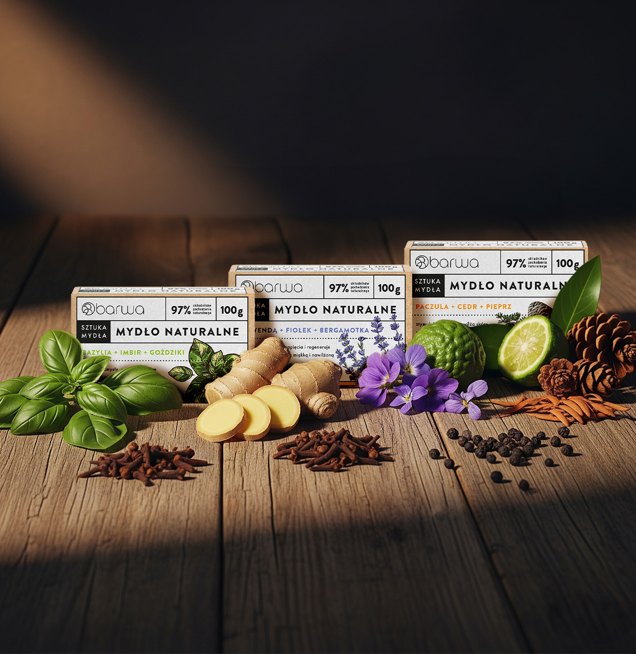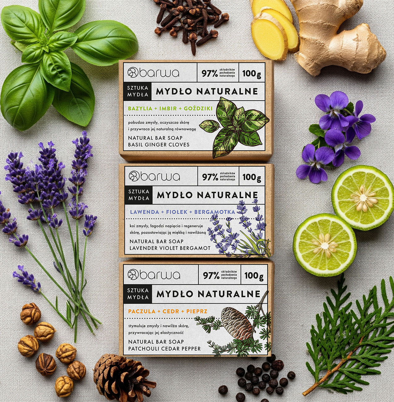 - W skład serii wchodzą 3 mydła w kostce: bazylia + imbir + goździki – pobudza zmysły, lawenda + fiołek + bergamotka – łagodzi napięcia, paczula + cedr + pieprz – stymuluje zmysły.